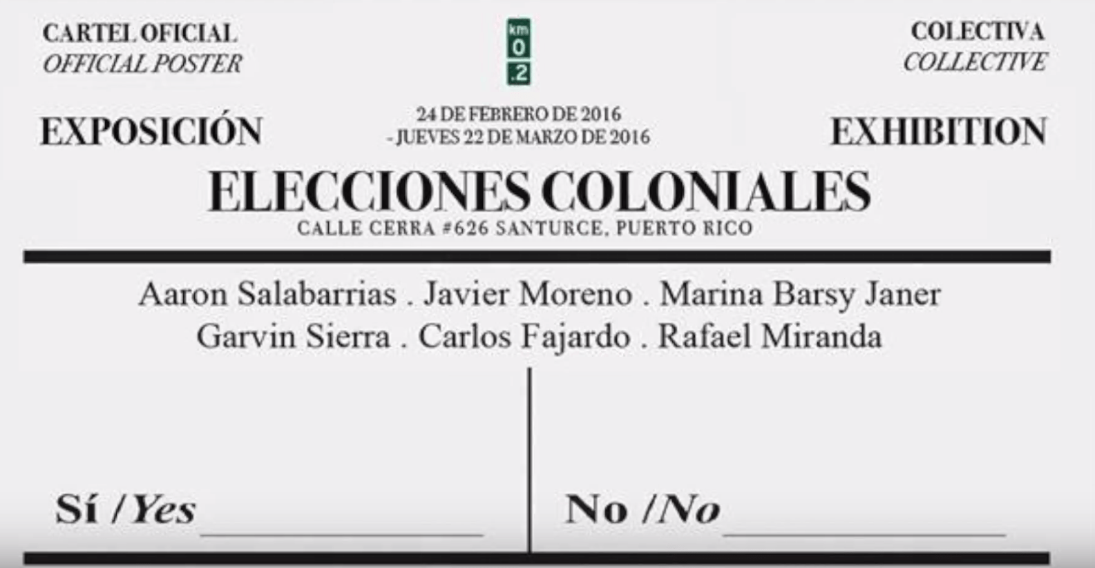 Exposición “ELECCIONES COLONIALES” CALLE CERRA, 626 SANTURCE PUERTO RICO, ARTISTAS , Arron Salabarrias, Javier Moreno, Marina Barsy Janer, Garvin Sierra, Carlos Fajardo, Rafael Miranda.